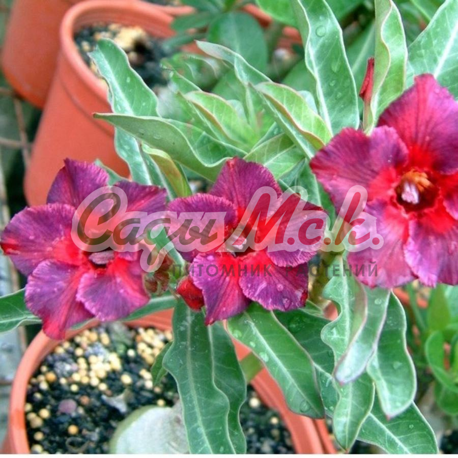 Главной изюминкой этого вида адениума является необычная пестрая листва. Адениум (Desert Rose) относится к долгожителям. У нас выращивается как комнатное. В домашних условиях вырастает до 0,5 м. Фантастический по красоте алый цветок. Цветет Адениум в основном с весны по осень. При соблюдении оптимальных условий выращивания может цвести почти круглогодично. Существуют экземпляры, возраст которых насчитывается более 75 лет. По утверждению разводчиков, эти растения способны жить до 200 лет, переходя из поколения к поколению