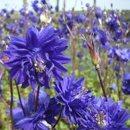 Очень красивый и элегантный высокорослый (60 – 80 см) сорт аквилегии с изящными ажурными серо-зелёными листьями. Ярко синие цветки собраны в довольно крупные густо-махровые соцветия до 5 см в диаметре. Глубокая корневая система хорошо переносит зимовку в открытом грунте. В первый год растение даёт 3-5 стеблей, во второй – 5-10. Хорошо сочетается с папоротниками, декоративными злаками, ирисами и колокольчиками. Прекрасно подходит для использования как бордюрное растение, для альпийской горки и на срезку.