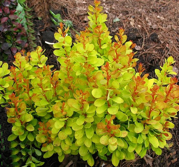 Саженцы барбариса Тунберга Golden Carpet получили своё название не просто так. Этот низкорослый кустарник высотой до одного метра с красиво изогнутыми, раскидистыми ветвями способен насытить ландшафт золотыми красками. Листья у барбариса мелкие приятного насыщенного жёлтого цвета. А осенью они преображаются в оранжево-красный ковёр. Коралловые плоды куста зреют осенью и сохраняются до весны. Крупномеры Golden Carpet можно сажать практически в любую почву, главное – обеспечить хороший дренаж. Весь свой потенциал растения раскрывает при достаточном количестве солнечного света.