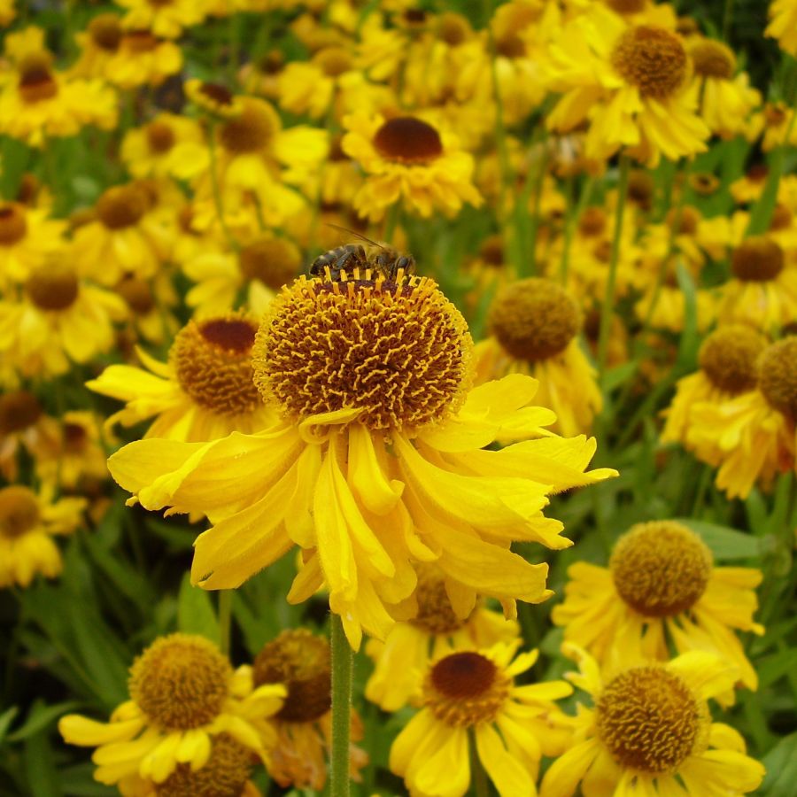 Гелениум Зе Бишоп: Цветки крупные, с золотисто-жёлтыми лепестками и тёмно-коричневым контрастным центром. Летнецветущий сорт (с середины июня до начала августа). Высота растения 70 см.