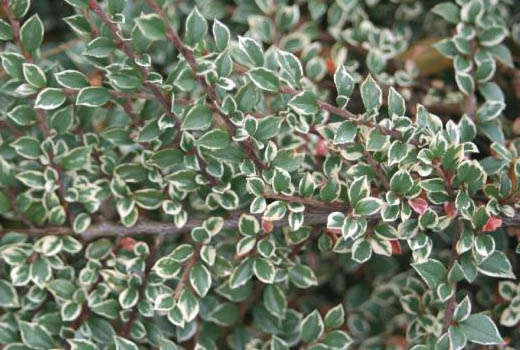 Кизильник Variegatus - в высоту может достигать 30 см, одновременно разрастаясь на полтора метра в диаметре. Такой кустарник является вечнозеленым и очень красив в осенние месяцы. Именно в этот период его листья приобретают красный или розовый цвет с небольшой каймой кремового цвета. Кроме того, каждый из листков имеет белую полосу по краю, длинной примерно в 1,5 см.