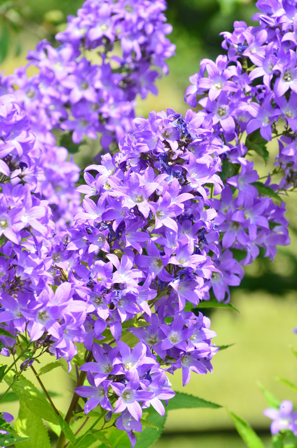 Campanula lactiflora "Prichard's Variety" - Колокольчик молочноцветковый "Причард'с Вариети". Многолетнее растение с прямыми, облиственными, ветвистыми стеблями 120-150 см высотой. Цветки лавандово-голубые, до 3-4 см в диаметре, собраны в крупные кистевидные соцветия, насчитывающие до 80-100 цветков.