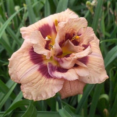 Лилейник Yоur Angеl – травянистое садовое растение, способное удивлять своей красотой весь сезон. Весной оно поражает сильной, быстро наросшей розеткой ярко-зеленых листьев, которые до поздней осени остаются декоративными. А вот в июле-августе можно любоваться цветением этого поразительно эффектного многолетника. Его огромные, нежно-лососевые цветки, достигающие в диаметре 16 см, на солнце меняют окраску и становятся почти белыми. На нежном фоне махровых лепестков ярким пятном выделяется пурпурный глазок и желто-зеленое горло. За сезон на взрослом растении может раскрыться до 200 таких чудесных, элегантных цветков. Эффектный сорт можно использовать как в группе с другими многолетними растениями, так и в одиночных посадках.
