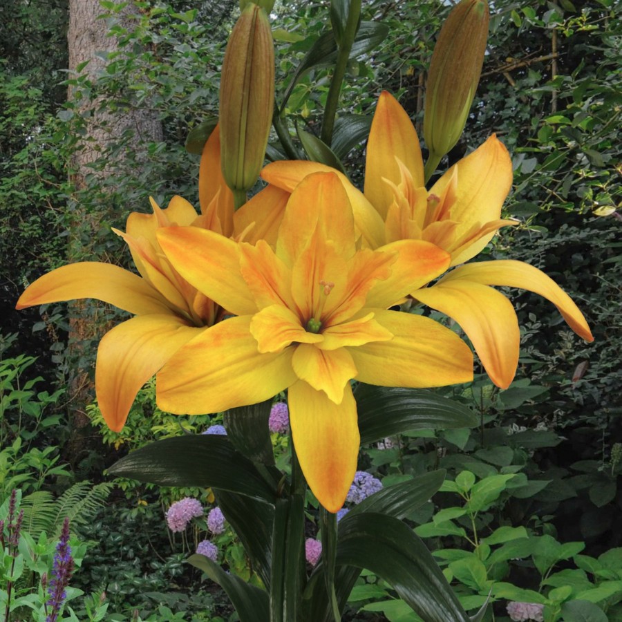 Лилия азиатская махровая Голд Твин (Lilium asiatic Gold Twin) принесет на клумбы немного солнечных зайчиков. Высокие стебли до 90 см с мягкой зеленью листьев, крупные, до 18 см, цветки без запаха и пыльцы, яркого темно-желтого цвета с легким красноватым оттенком по краям лепестка — идеально украсят помещение в срезанном виде. При высадке в открытом грунте устойчивы к болезням, на зиму не требуют укрытия, но не терпят застоя воздуха и воды в почве. Лучше всего растут на солнечных местах, но полутень тоже подойдет. Используются Лилия азиатская махровая Голд Твин в ярусных посадках, групповых, миксбордерах.