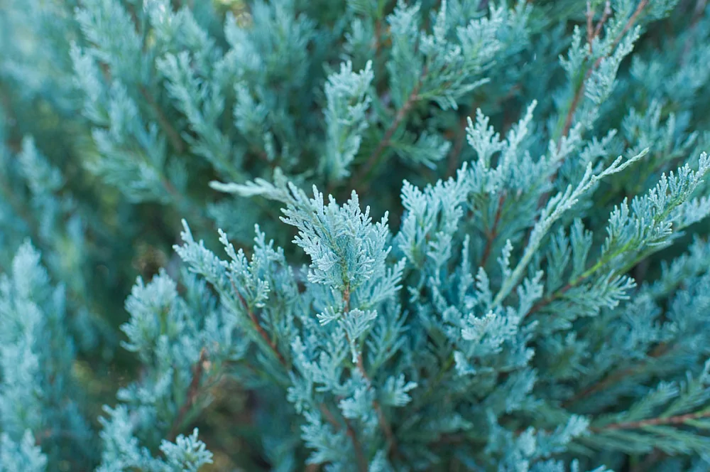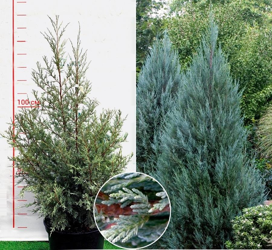 Это скальный можжевельник, который, согласно описанию, способен достигать 18 м в высоту и 2 м в диаметре. Однако таких внушительных габаритов растение достигает только в естественной среде обитания, а в городских посадках его размеры намного скромнее – можжевельник ниже и тоньше, но это никак не уменьшает декоративность сорта. Крона конического типа начинается практически от земли, но по мере роста начинает постепенно округляться. Побеги текущего года имеют глубокий голубовато-зеленый или светло-голубой цвет. Длина хвои достигает 12 мм в длину и 2 мм в ширину, после цветения можжевельника формируются плоды – их внешний вид напоминает шарики темно-синего колера, внутри шишкоягод образуются красновато-бурые семечки, вырастающие до 5 мм. Ежегодный прирост составляет примерно 15–20 см.