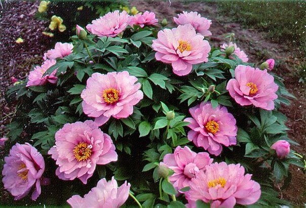 Пион ИТО-гибрид First Arrival замечательное растение с блестящими соцветиями необычной окраски. Бутоны имеют лавандово-розовый цвет, позже они приобретают мягкий розовый оттенок. Лепестки украшены красными пятнами у основания. Листья глубоко разделенные, осенью окрашиваются в красный цвет. Средний срок цветения. Запах слабый. Высота растения 70 см, размер цветка 19 см.