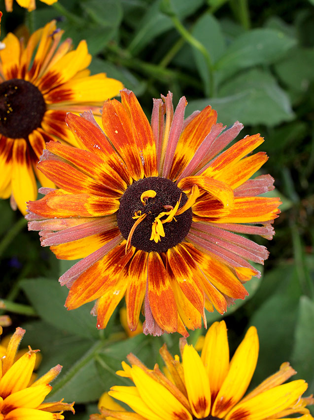 Рудбекия волосистая Чим Чимни/ Chim Chiminee. Цветки большие, с десятью различными оттенками — от жёлтого до оранжевого и кирпично-красного. Лепестки очень узкие, окружают коричневый конус. Великолепный сорт для срезки. Устойчив к засухе.