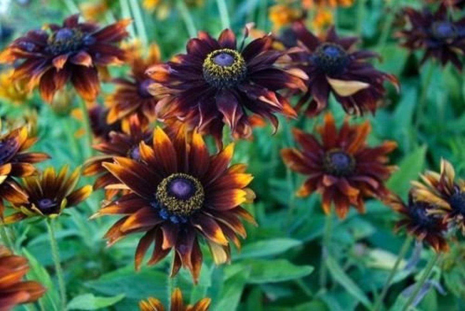 Рудбекия волосистая Морено. Ее отличительная черта — огромные соцветия оттенка красного дерева с оранжевыми кончиками лепестков. Растение невысокое от 30 до 50 сантиметров.