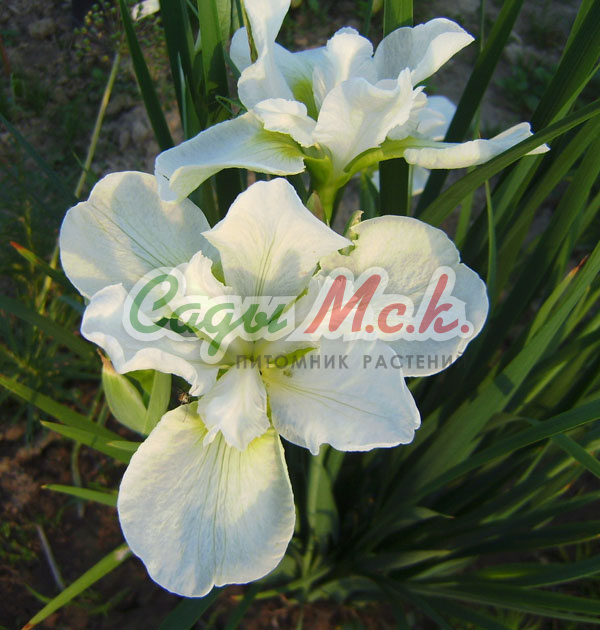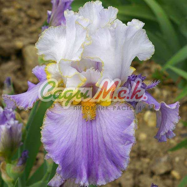 Ирис World Premier порадует вас льдисто-белыми стандартами и таким же ободком на сине-пурпурных фолах. Высота цветоноса 92 см.