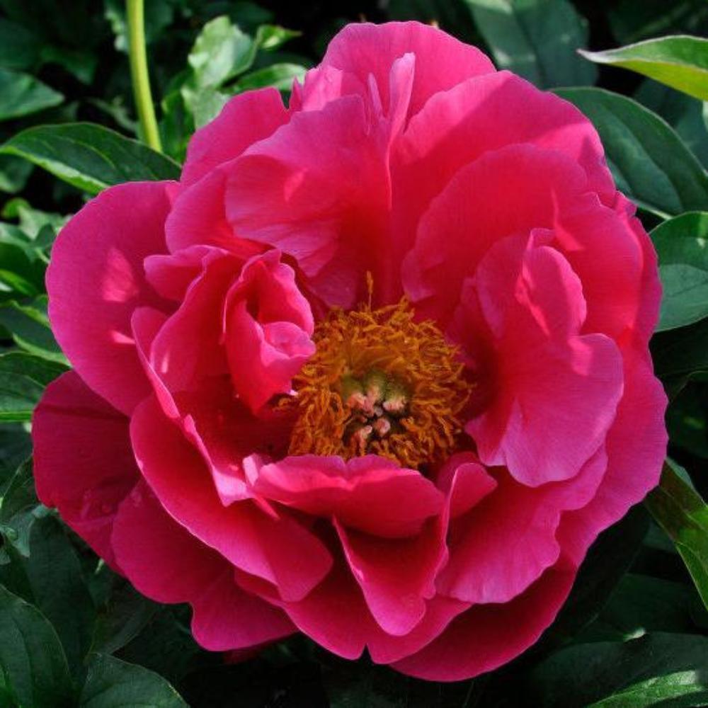 Семена пиона Eventide – находка для дизайнерского ландшафта. Крупный цветок чашевидной формы с малиново-красными вкраплениями в сердцевине и рельефной текстурой, пестики зеленоватого оттенка с розовыми рыльцами, пыльники желтоватые. Кустарник высокий с волнистой темно-зеленой листвой отличается ранним сроком цветения.