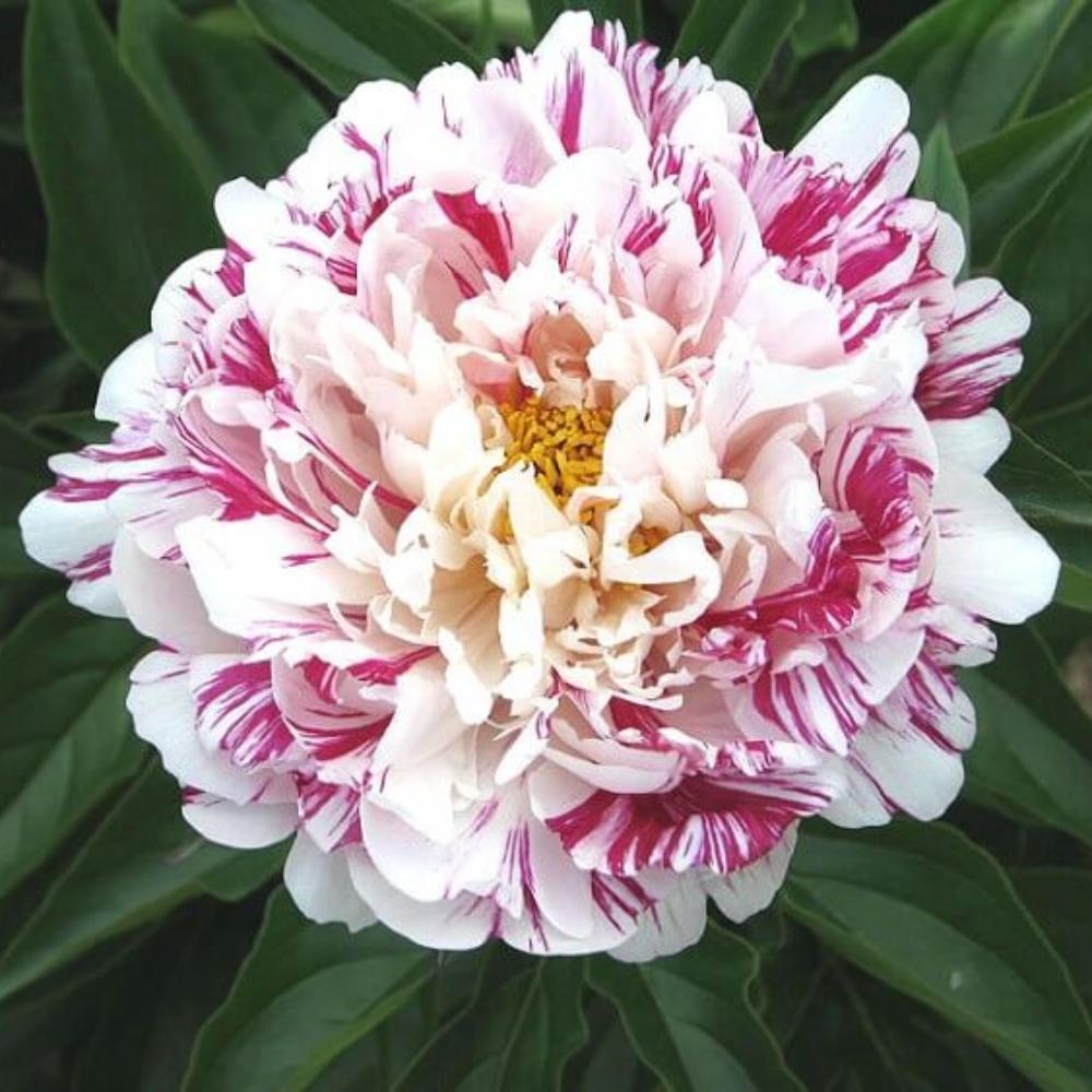 Травянистый пион Candy Stripe махровый. Крупные белые соцветия с малиново-красными полосками притягивают восхищенные взгляды. А их легкий, приятный аромат не оставит никого равнодушным. Средне-поздний срок цветения. Высота 80 см. Размер цветка 18 см.