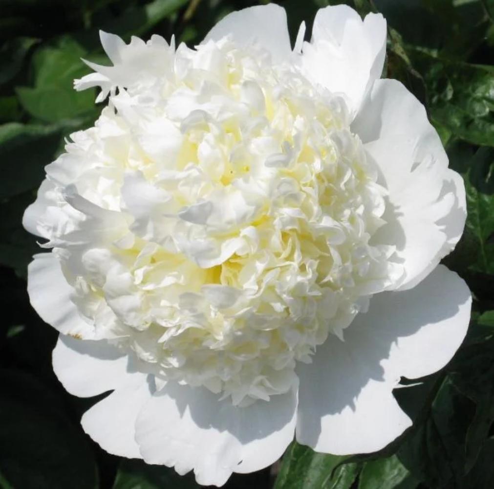 Травянистый пион Princess Bride махровый, бомбовидный. Белый. Внешние лепестки крупные, корона из узких лепестков с лёгким жёлтым оттенком, центр из крупных белых лепестков. Диаметр 18 см. Высота 80 см. Запах слабый. Средний срок цветения.