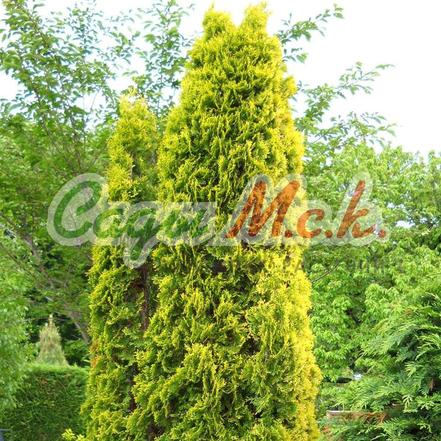 Узкая острая желто-хвойная туя высотой до 10 м. и диаметром кроны до 1,8 м. Дерево растет довольно быстро, ежегодно прибавляя до 30 см высоты. Имеет прямой, ровный и стройный ствол, к которому плотно прижимаются скелетные ветви, образуя красивую устремленную вверх общую форму дерева.Скелетные ветки короткие и мощные, тесно прижимаются друг к другу, а на концах начинают сильно ветвиться. За счет такого строение крона выглядит очень густой и плотной, формируется симметрично. Хвоя густая, яркая, золотисто-жёлтая, не подгорает на солнце, зимой приобретает бронзовый оттенок. Хорошо себя чувствует как на солнце, так и в полутени. На солнце не горит.<br>