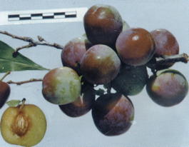 Плоды массой 31-35 г, округлой формы, высота 34 мм, диаметр в двух плоскостях 34 мм. Воронка плода узкая, мелкая, вершина округлая, основание с углублением. Окраска плода бурая, покровная фиолетовая, пятнами, с восковым налетом, подкожных точек нет. Мякоть буровато-желтая, средней плотности, суховатая, сок бесцветный. Длина плодоножки средняя – 14 мм. Косточка овальная, массой 0,75 г, что составляет 2,4% от массы плода. От мякоти отделяется хорошо. В плодах содержится сухих веществ – 14,1%, сахаров – 8,9%, кислот – 2,1%. Внешний вид плодов оценивается на 4,3 балла. Дегустационная оценка свежих плодов 4,1 балла. Отрыв плодов от плодоножки хороший. Сорт столового назначения.