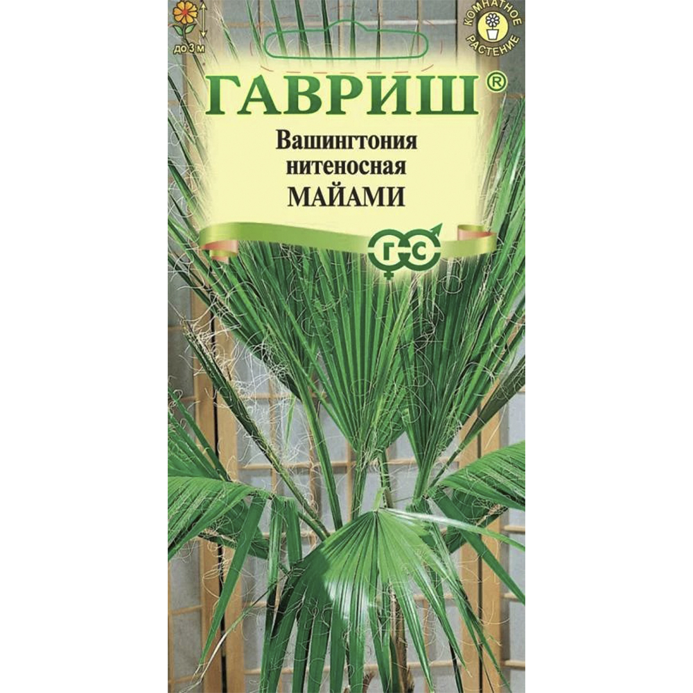 Красивая многолетняя пальма достигающая в природе 20 м. Растение неприхотливое, очень интересное для комнатного цветоводства. Вашингтония нитеносная отличается от вашингтонии робусты относительно невысоким, но толстым стволом, и более рыхлой кроной. Она предпочитает расти в сухих местах и чуть более устойчива к холоду. Эффекные зеленые веерные листья (до 2 м) на развитых черешках состоят из многочисленных листовых сегментов, между которыми свисают тонкие кудрявые нити. В природных условиях засохшие листья отгибаются книзу и висят на дереве, образуя вокруг ствола широкую "юбку" . В домашних условиях увядающие листья удаляют вместе с большей частью черешка, остатки черешков одревесневают и образуют мощный ствол. Цветет весной длинными кистями с ароматными желтыми или белыми цветами. С конце лета созревают красно-черные плоды с овальными семенами. Размножается семенами. Семена замачивают на двое суток в теплой воде, затем высаживают в рыхлый субстрат из дерновой, листовой земли и песка (2:2:1). При комнатной температуре всходы появляются через месяц. Вашингтония предпочитает солнечные места и обильный полив теплой водой в период интенсивного роста. С наступлением осени полив постепенно сокращают, растение размещают в светлом прохладном месте. Ежегодно пальму переваливают, постепенно увеличивая размер горшка. В южных регионах вашингтонию нитеносную можно выращивать в открытом грунте, укрывая на зиму ствол (литья удаляют).